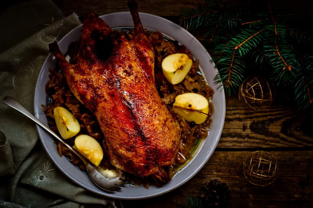 Prikimškite antį paruošto įdaro. Galite užsiūti ar sukabinti dantų krapštukais, kad įdaras neiškristų. Į kepimo formą įpilkite maždaug pusę ar visą stiklinę vandens, kad antis neišsausėtų, ir pridenkite ją folija.