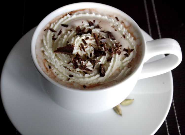 Puode įkaitinti pieną. Suberti kardamono sėklas, cukrų, sudėti šokoladą, išmaišyti ir palaukti, kol viskas pradės virti. Nuimti nuo ugnies ir leisti pastovėti apie 10 minučių. Tada vėl viską pakaitinti, kol užvirs. Nuėmus nuo ugnies nukošti ir supilti į puodelius. Patiekti su plakta grietinėle ir šokolado drožlėmis.