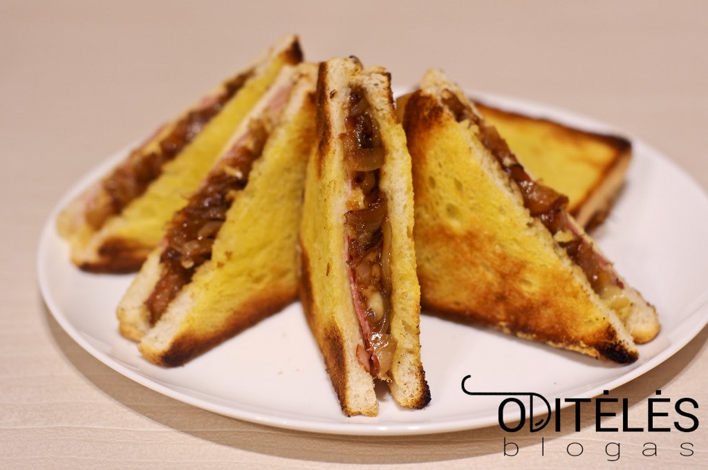 Imkite 8 batono riekeles, iš abiejų pusių aptepkite minkštu sviestu ir sudėkite į kepimo skardą. Ant kiekvienos uždėkite keptų karamelizuotų svogūnų, sūrio riekelę ir kumpio riekelę. Tada ant viršaus vėl uždėkite iš abiejų pusių sviestu apteptas batono riekeles.