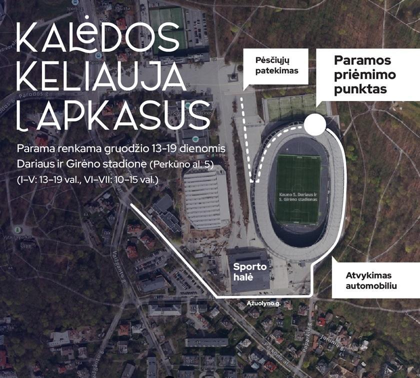 Atvykstantieji pėsčiomis į paramos priėmimo patalpas pateks iš Sporto g. aikštės, per stadione įsikūrusio Žiemos miestelio įėjimą. Keliaujantiems automobiliais numatytas privažiavimas iki pat sandėliavimo patalpų – Ąžuolyno gatve, pro Kauno sporto halę. Lengviau susiorientuoti padės nuorodos, nukreipiamieji ženklai.