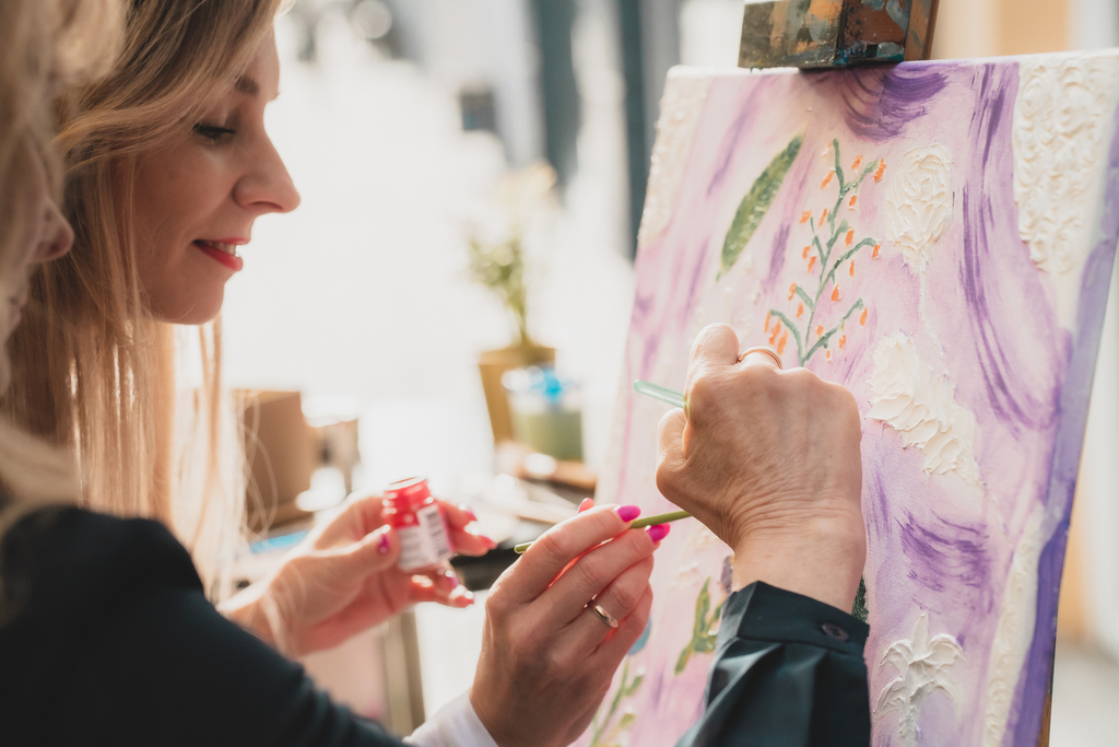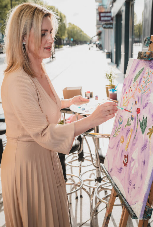 Kūrėja mėgsta išbandyti įvairias technikas: dažus ir lieja, ir tepa su voleliu, šiurkščiu teptuku, mentele, pirštais.