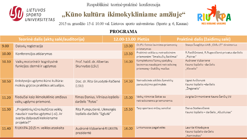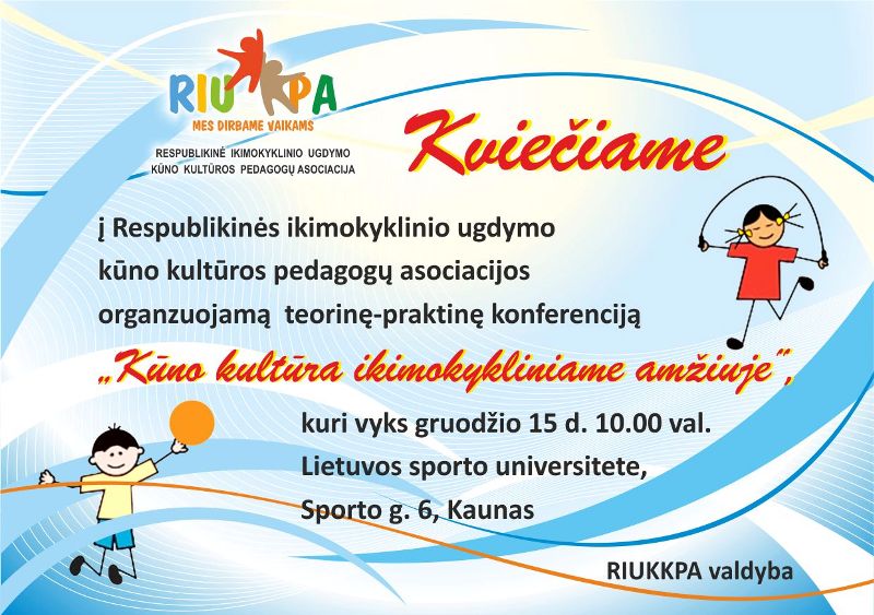 Gruodžio 15 d. Kaune, Lietuvos sporto universitete, vyks respublikinė teorinė-praktinė konferencija „Kūno kultūra ikimokykliniame amžiuje“. Konferencijos programa labai plati ir išsami, apimanti mokslu pagrįstas aktualijas bei praktinių veiklų pristatymus. Kviečiame visus, besidominčius ikimokyklinio amžiaus vaikų fizinio aktyvumo didinimu.
