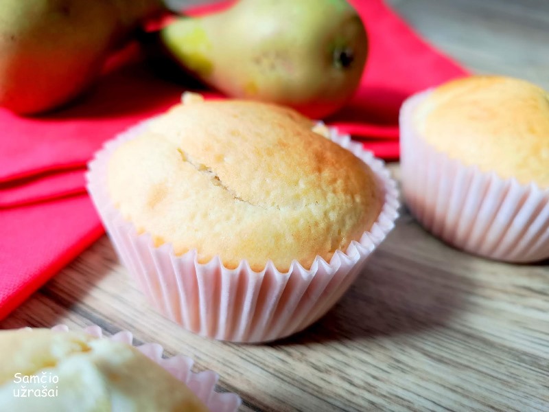 Kriaušes nulupkite ir supjaustykite kubeliais. Suberkite kubelius į tešlą ir gerai išmaišykite.