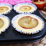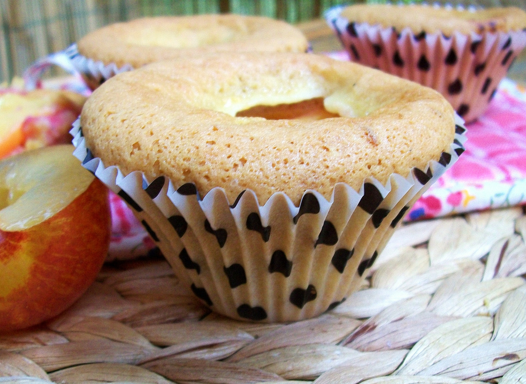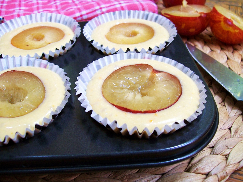 Šaukštu į formeles sukrėskite tešlą (užpildykite maždaug pusę kiekvienos formelės). Ant keksiukų viršaus uždėkite po slyvos puselę ir kepkite orkaitėje apie 25 minutes. Skanaus!