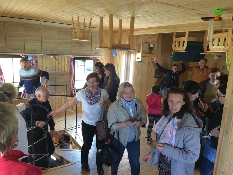 Kitas mūsų aplankytas objektas nustebino ir pralinksmino, nes tai buvo šalia Labirintų parko įsikūręs Apverstas namas. Užėjus į vidų ir pamačius apverstus įprastus baldus ir daiktus, visiems „susisuko“ galvos. Nors tai ne itin malonus jausmas, tačiau daug kas pozavo ir iš namo išėjo šypsodamiesi – juk ne kasdien lankomės name, kuris yra aukštyn kojom. Aplankėme ir ant Liudiškių kalvos esantį Laimės žiburį, kurį savo apsakyme aprašė lietuvių literatūros klasikas Jonas Biliūnas. Ne visi ekskursijos dalyviai žinojo, jog čia yra šio garsaus rašytojo kapas ir jam skirtas antkapinis paminklas (architektas V. Gabriūnas). Užkopti aukštyn iš tašytų akmenų suręstais 90 laiptelių nebuvo lengva, bet tikrai verta. Ne tik pagerbdami Joną Biliūną, bet ir galvodami apie savo norus, kurie esą gali išsipildyti, aplink Laimės žiburį apsukome tris ratus.
