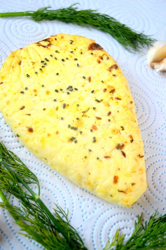 Česnakus išspausti, sumaišyti su džiovintomis žolelėmis, kmynais, druska ir pipirais. Šiuo mišiniu ištrinti sūrį ir dėti valandai į šaldytuvą.
