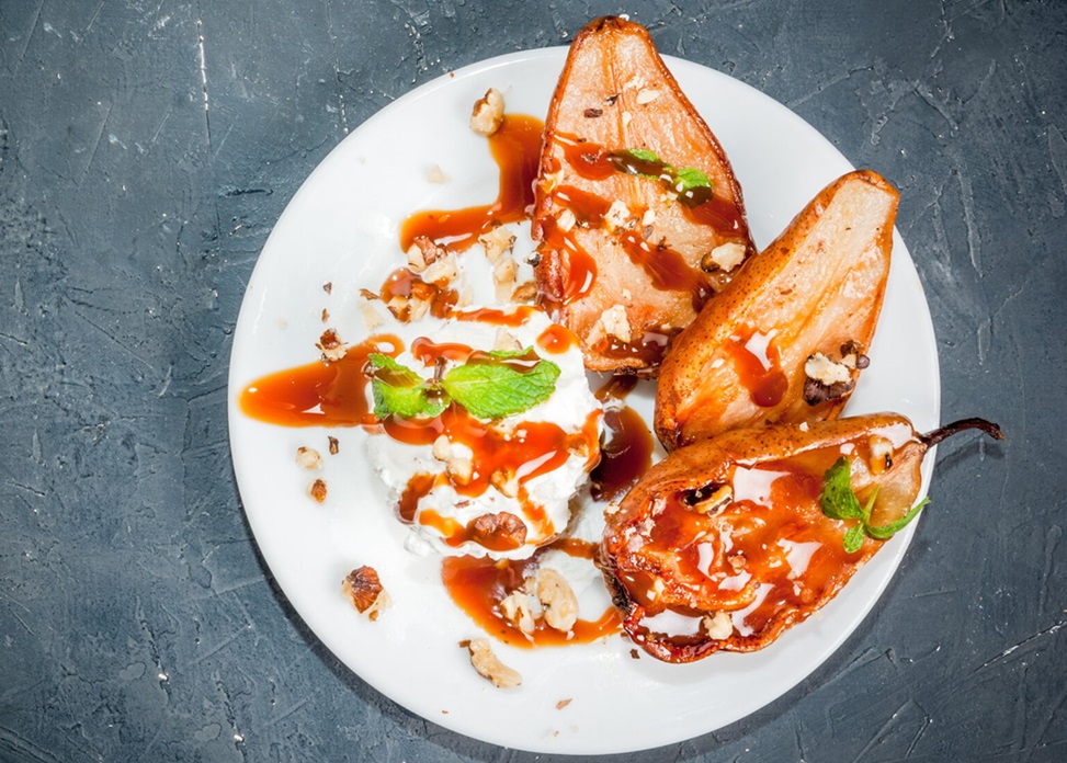 Dėkite kriaušes ant įkaitusio grilio pjūvio puse žemyn ir 2–3 minutes jų nejudinkite, kad išryškėtų grilio žymės, tada patikrinkite, ar kriaušės iškepusios.