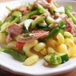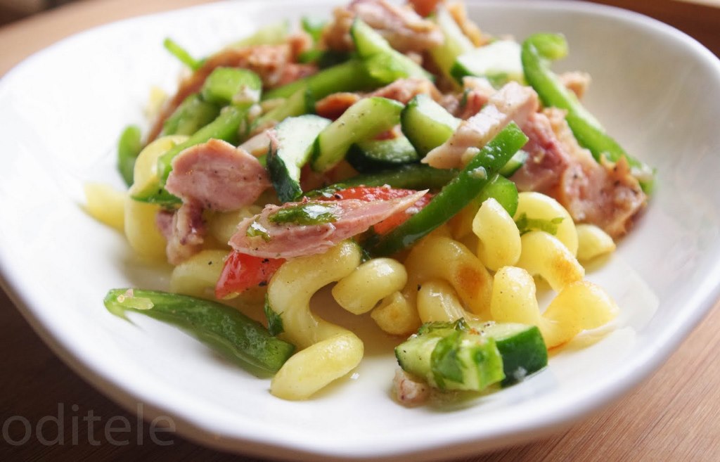 Makaronus išverdame pasūdytame vandenyje, tik neperverdame, supilame į kiaurasamtį ir perliejame šaltu vandeniu.