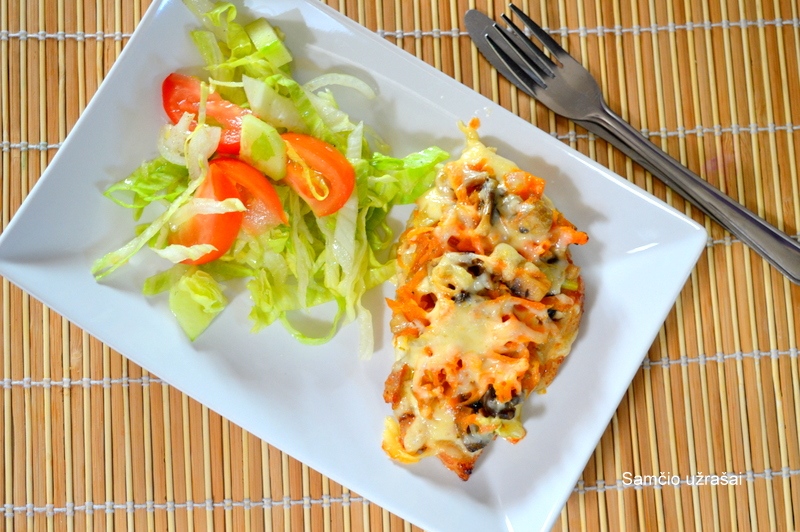 Dedame juos į skardą, vos vos patepame majonezu, dedame kepintas daržoves, užberiame sūriu ir kepame 200 °C temp. apie 10 min., kol sūris gražiai išsilydo.