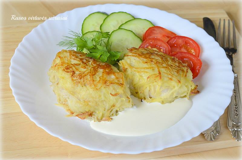 Suktinukus pavoliokite miltuose, tada pamirkykite kiaušinio plakinyje ir rankomis iš visų pusių apspauskite bulvių tarkiais.