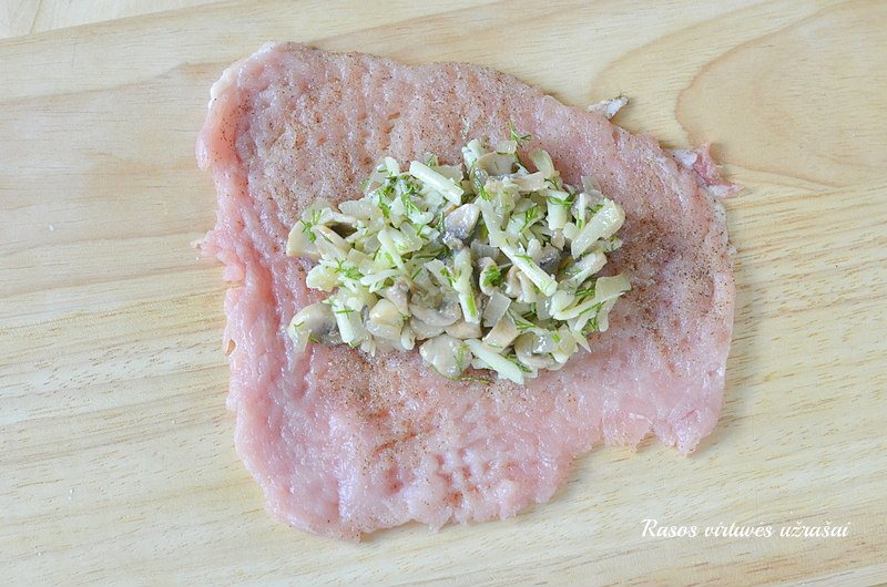 Ant išmuštos mėsos dėkite įdarą, mėsos kraštelius užlankstykite kaip vokelį ir susukite suktinukus. Rankomis paspauskite ir paformuokite, kad būtų tvirtesni.