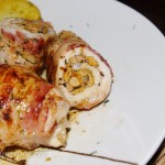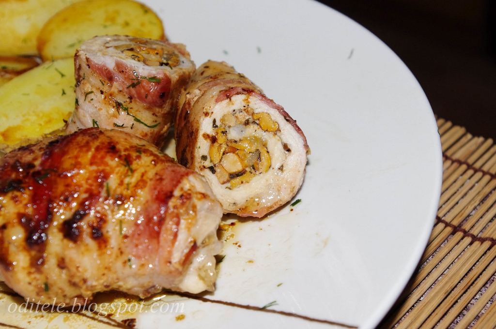 Imkite nugarinės gabalėlį, dėkite voveraičių įdaro, susukite. Suktinuką apvyniokite šoninės juostele ir sutvirtinkite mediniu pagaliuku.