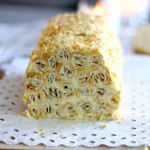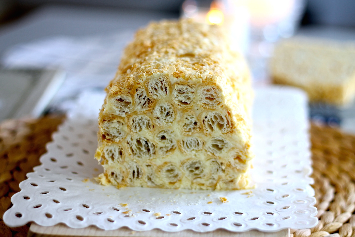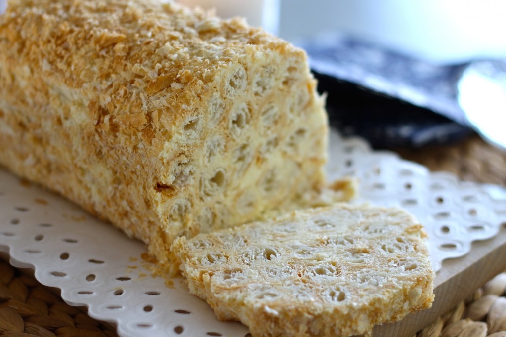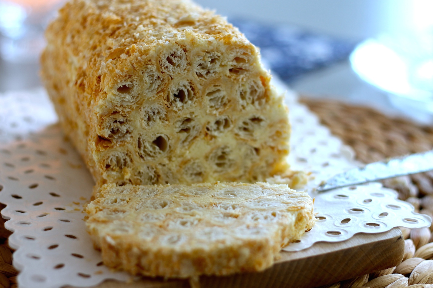 Ant maistinės plėvelės dedame po penkias ar šešias iškeptas ir atvėsusias juosteles. Ant viršaus užtepame kremo ir vėl dėliojame juosteles. Susluoksniuotą desertą susukame į plėvelę kaip įprastą kakavinį „Tinginį“ ir pastatome į šaldytuvą sutvirtėti. Po 8–10 valandų ištraukiame ir aplipdome sluoksniuotos tešlos trupiniais. Pjaustome ir skanaujame.