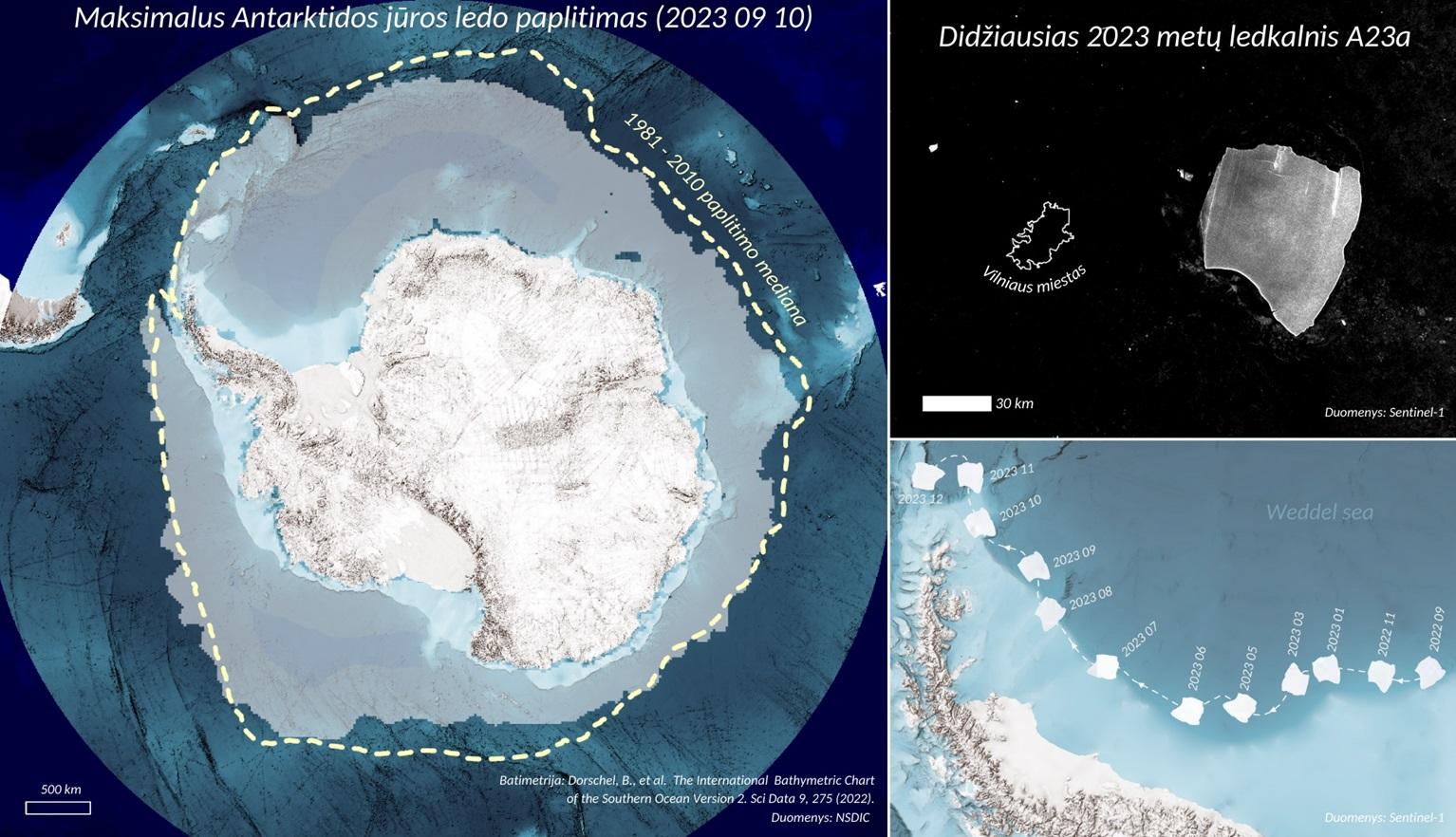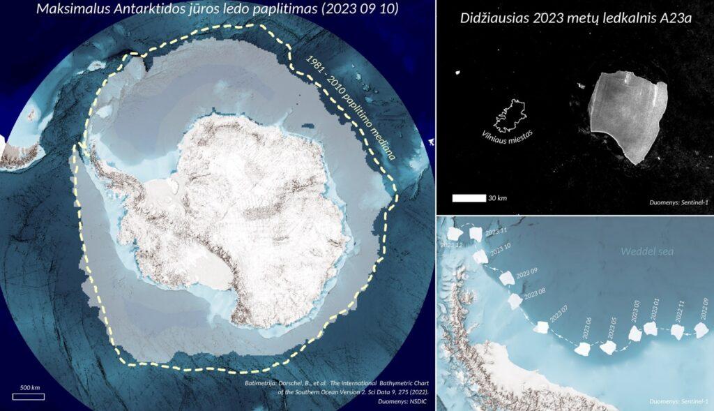 Antarktidos jūros ledas radiometrais stebimas taip pat nuo 1979 m. VU geografai pateikia palydovinėmis nuotraukomis grįstą iliustraciją, vaizduojančią 1981–2010 m. Antarktidos jūros ledo maksimalaus paplitimo medianą, pažymėtą geltona linija, ir balkšva spalva pažymėtą 2023 m. maksimalų ledo paplitimą. Nors Antarktidos jūros ledo tirpimas lėtesnis nei Arkties, 2023 m. rugsėjį užfiksuotas mažiausias maksimalus jūros ledo išplitimas per visą stebėjimų istoriją.