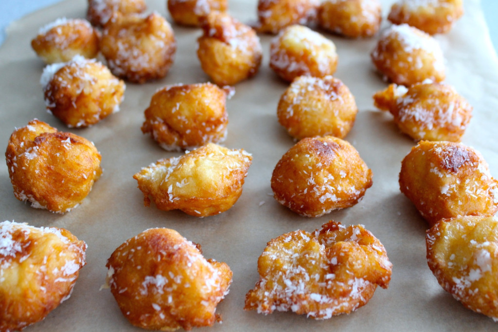 Išvirusias spurgytes nusausiname ant popierinio rankšluosčio. Pabarstome milteliniu cukrumi, kokoso drožlėmis.