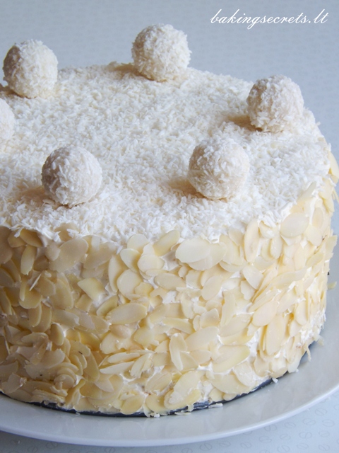 Tortą aptepkite plakta grietinėle, šonus apibarstykite migdolų drožlėmis, viršų – kokosų drožlėmis. Puoškite „Raffaello“ saldainiais.