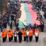 Pagrindinėje miesto gatvėje trispalvę išskleisti padėjo būrys žmonių, visi norėjo prisiliesti prie istorinio momento žemaičiams. Iki Nepriklausomybės aikštės vėliavą lydėjo Telšių muzikos mokyklos pučiamųjų orkestras. Tuo pat metu, kai Respublikos gatvėje plazdėjo įspūdingo ilgio vėliava kartu su ją laikančių širdimis, nugriaudėjo savanorių salvės. Pirmoji − už Lietuvos vienybę, išsaugotą viename simbolyje − trispalvėje, antroji − už kartą, kuriai nulemta paveldėti Lietuvos istoriją, trečioji − už Lietuvos vaikus ir jaunus žmones bei už tėvus, senelius, mamas, brolius, seseris, kurie gyvybę paaukojo.