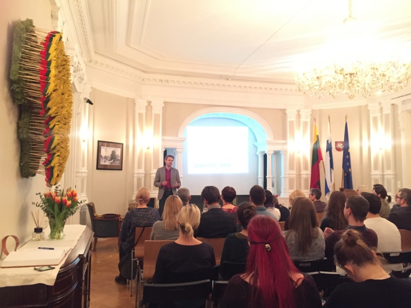 Lietuvos nepriklausomybės atkūrimo dienos proga Lietuvos ambasadoje Helsinkyje Suomijos lietuviai susitiko su žurnalistu, rašytoju, laidų vedėjų ir aktyviu visuomenės veikėju Andriumi Tapinu, su juo diskutavo Lietuvos politikos aktualijų, ekonomikos, geopolitikos, pilietinės visuomenės ir švietimo temomis.