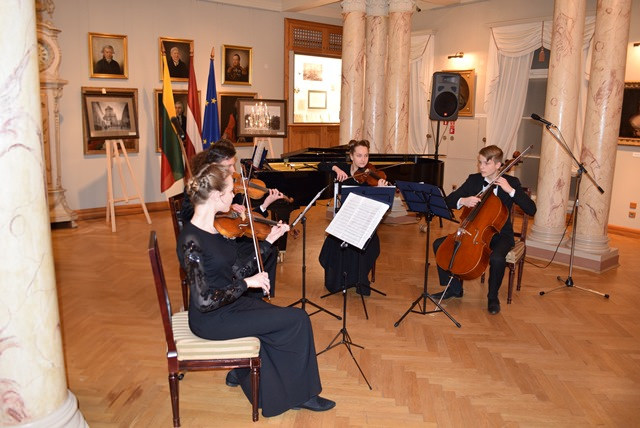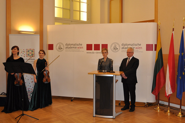 Vienos diplomatinėje akademijoje kovo 9 dieną susirinkę svečiai klausėsi Vienos muzikos ir vaizduojamojo meno universitete studijuojančių smuikininkių Ievos Pranskutės ir Simonos Venslovaitės atliekamų lietuvių kompozitorių kūrinių.