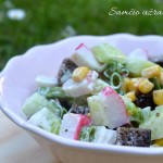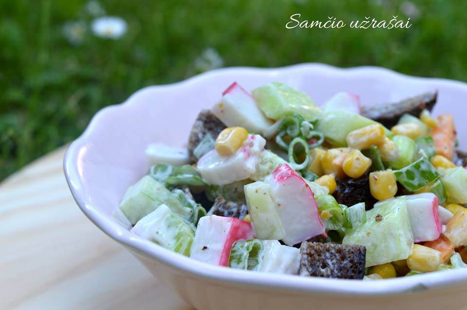 Jei inde dar lieka vietos sluoksniavimui, galima dėti smulkintą raudonąjį svogūną, vėl sluoksnį majonezo ir viršuje pomidorus.