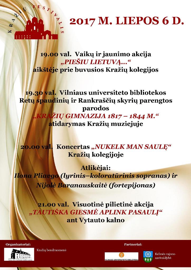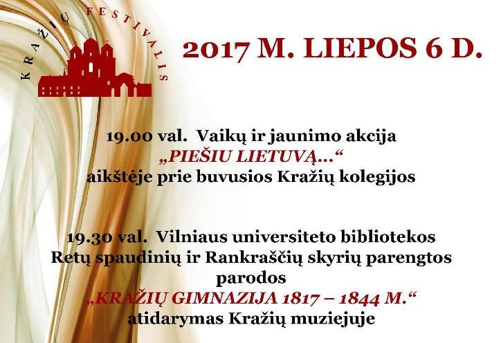 Š. m. liepos 6 dieną Kražių festivalis 19.00 val. aikštėje prie buvusios Kražių kolegijos prasidės vaikų ir jaunimo akcija „Piešiu Lietuvą…“.