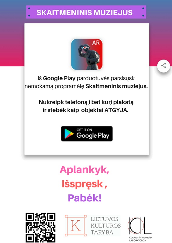 Projekto „SkaitMENINIS muziejus“ lankytojai kviečiami „patirti eksponatus“. Eksponatai čia pateikiami taikant papildytos realybės (augmented reality) techniką, kurią visame pasaulyje išpopuliarino žaidimas „Pokemon go“ ir „Snapchat“ socialinis tinklas. Tik, užuot pasipuošę žaismingomis gyvūno ausytėmis, Lietuvos muziejiniai ir kultūros eksponatai čia atgyja ir ima sąveikauti su žiūrovais. Tam, kad atgaivintumėte statišką plakatą, Jums į telefoną reikės parsisiųsti nemokamą mobiliąją programėlę. Tada nukreipti telefono kamerą į norimą objektą ir pamatysite, kaip, pavyzdžiui, iš plakato išskris Dariaus ir Girėno lėktuvas „Lituanica“ ar kaip į tuščią plakatą įžengia velnias ir ten padeda Puntuko akmenį. Realus pasaulis susimaišys su virtualiu ir Jums, naudojantis telefonu, bus leista pažaisti su tikrove.