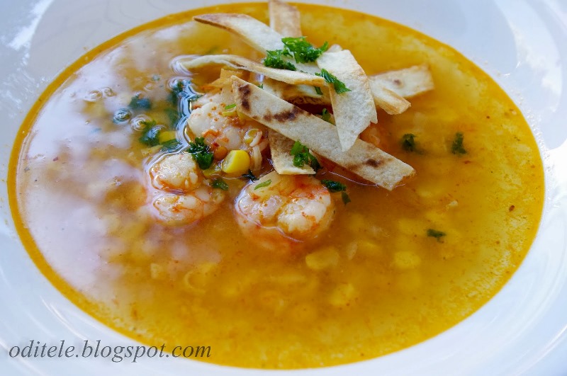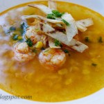 Galiausiai sudėkite šviežias krevetes ir virkite apie 1 min. Patiekite su tortilijos juostelėmis ant viršaus.