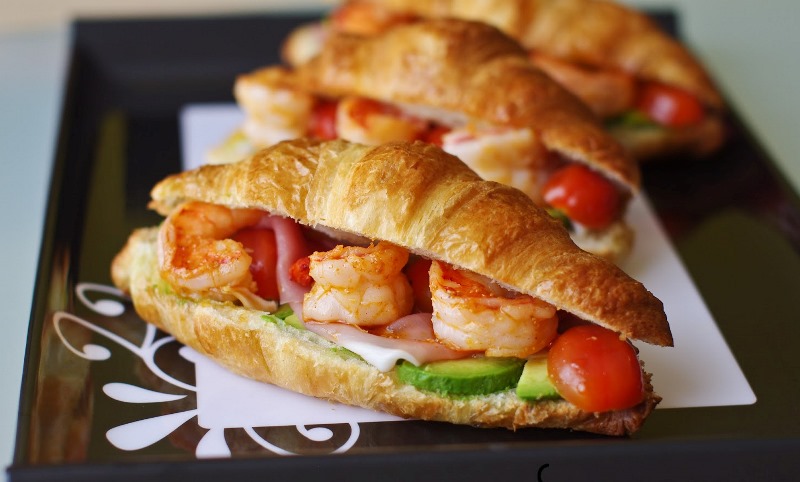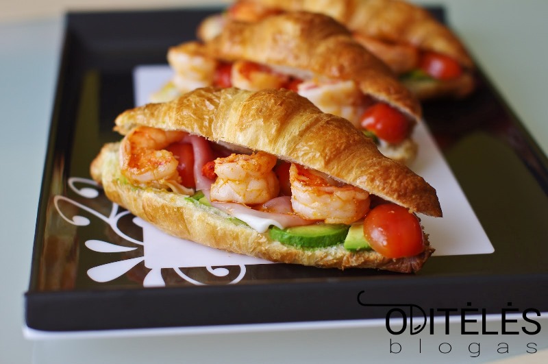 Išilgai perpjaukite kruasanus, išdėliokite pjaustytas avokado skilteles, kiaulienos kumpį, per pusę perpjautus pomidorus ir keptas krevetes.
