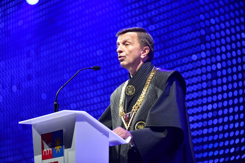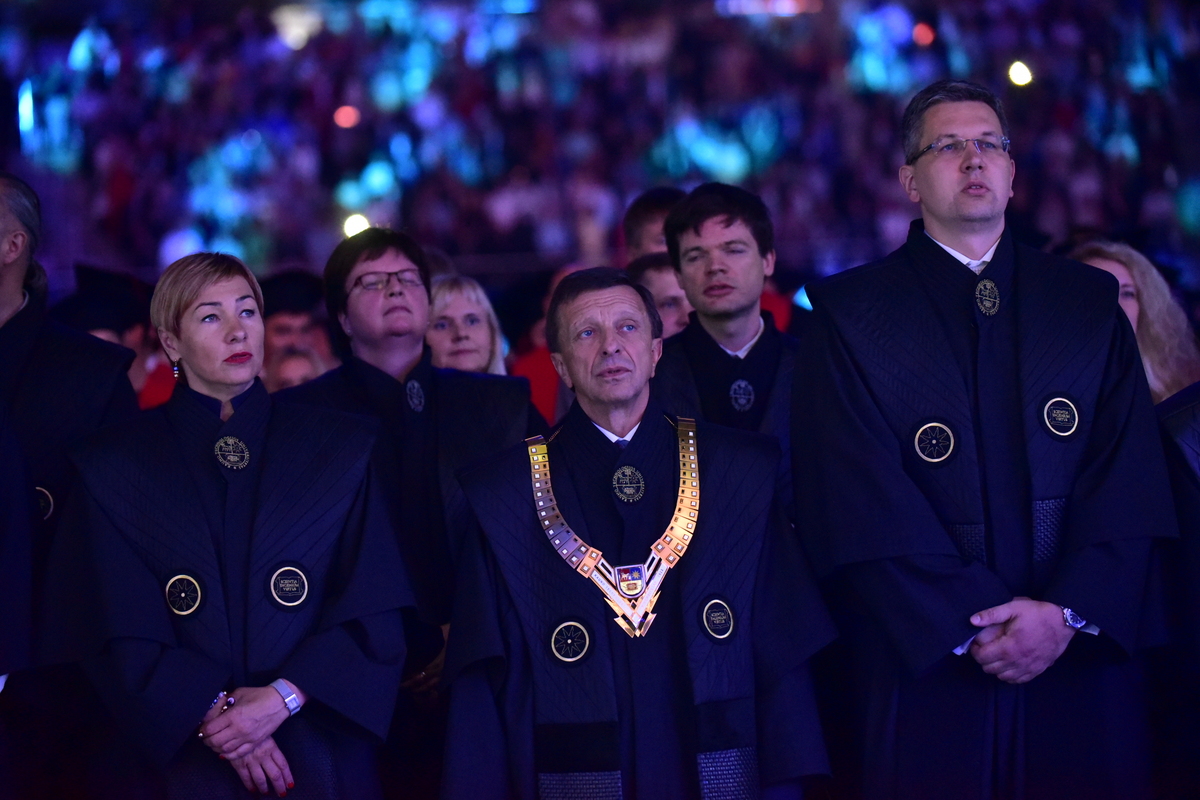 „Jau galite žengti savo žingsnį – ne medijos sukurtų žvaigždžių, ne konkuruojančių bičiulių, o savo. Ateities gyvenimą pradėkite gyventi iš karto. Pradėkite taip, kad jaustumėte jo skonį“, – absolventams linkėjo KTU rektorius Petras Baršauskas.