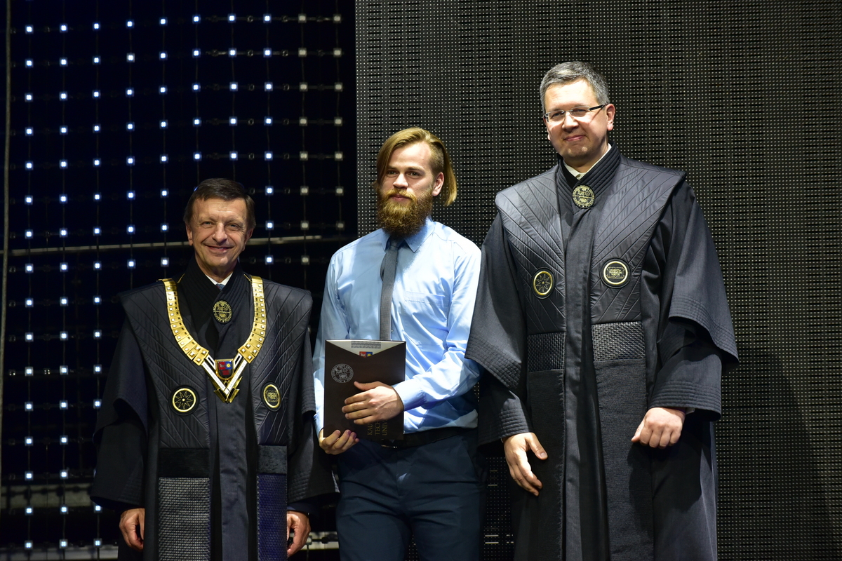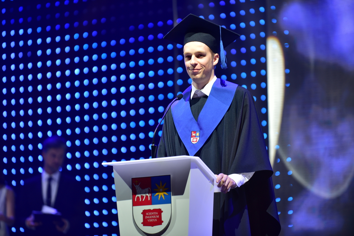 Paskutinis į sceną, pasipuošęs mantija, kaip ir 2 tūkst. kolegų, užlipo KTU Studentų atstovybės prezidentas Lukas Kijauskas, kuriam šiandien taip pat įteiktas bakalauro diplomas.