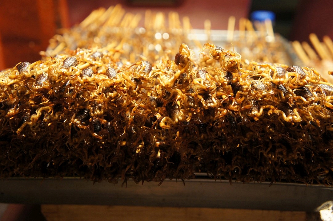 Papildydamas bendrakeleivį T. Baltramonaitis pažymėjo, kad miestų gatvėse apstu įvairiausio maisto, kuris paruošiamas čia pat. Lietuviams teko išbandyti ne tik skorpionų ir skėrių, bet ir skarabėjų, varlių, žiogų, kalmarų, kitų neįprastų kinų patiekalų.