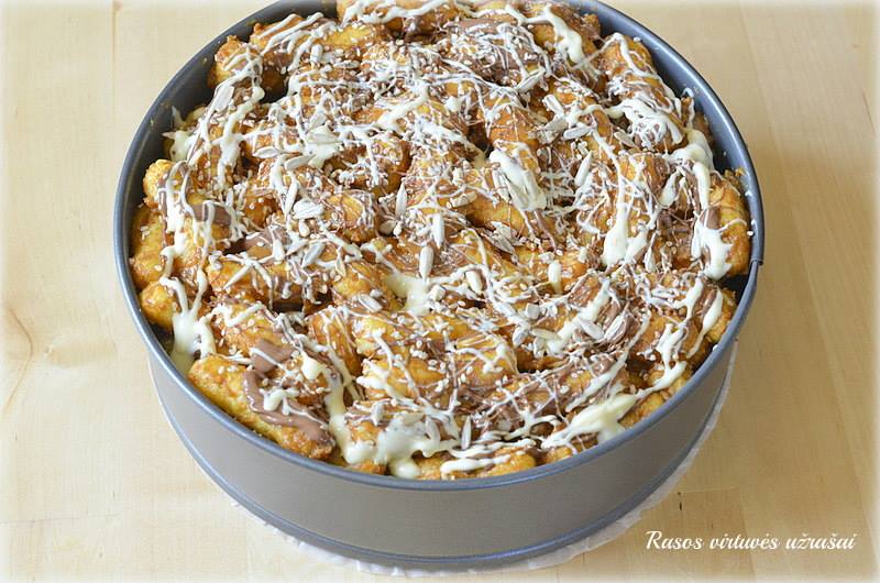 Torto viršų papuoškite lydytu šokoladu ir pabarstykite saulėgrąžų ir sezamo sėklų.