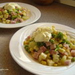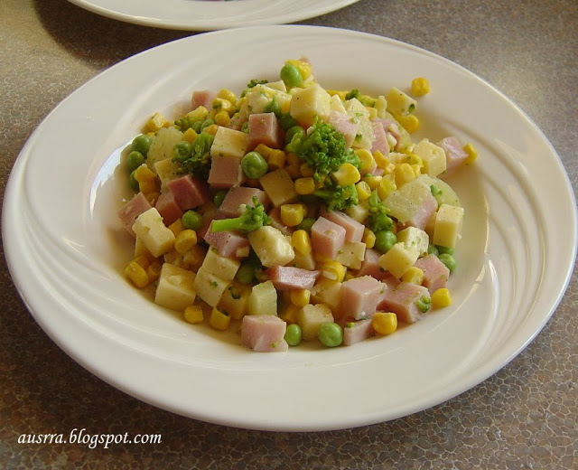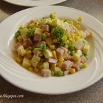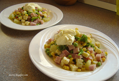 Kumpį ir sūrį supjaustome kubeliais. Brokolius išskirstome ir apverdame pasūdytame vandenyje (maždaug 3 minutes, kad išliktų šiek tiek traškūs). Viską sumaišome, pagardiname druska, pipirais, kapotu česnaku. Skaniausia valgyti su majonezu.