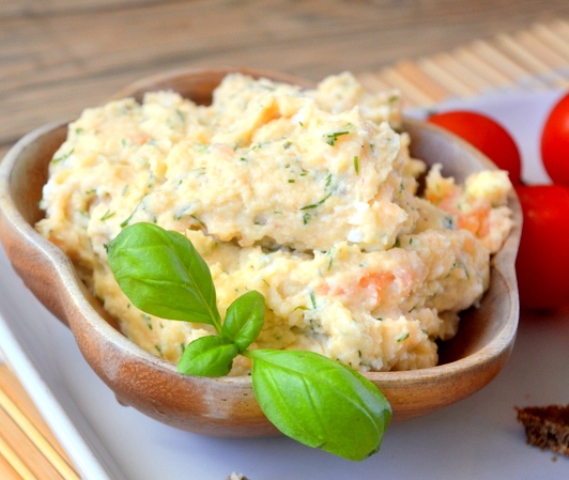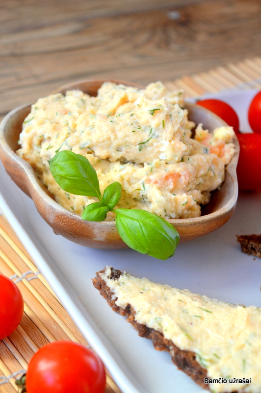 Pastaba: galite kiaušinius, lašišą ir svogūną smulkiai supjaustyti, o ne trinti trintuvu.