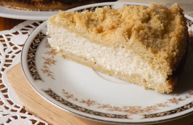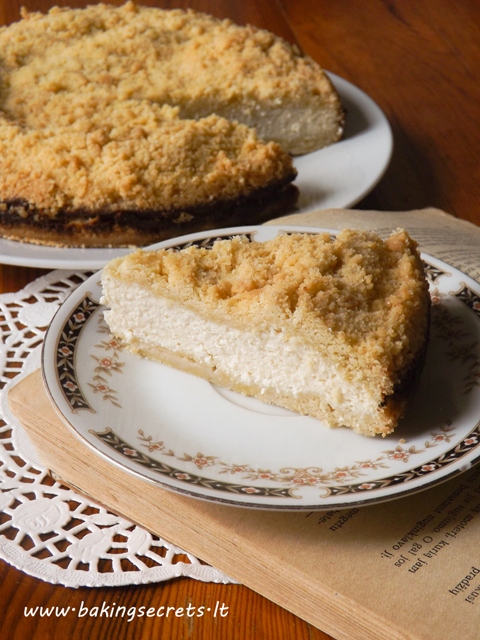 Įdarui skirtus produktus gerai išmaišykite. Pilkite įdarą į kepimo formą ir tolygiai užbarstykite likusius trupinius. Kepkite apie valandą iki 190 °C įkaitintoje orkaitėje.