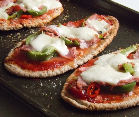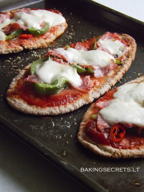 Pitas sudėkite ant skardos. Patepkite pomidorų tyre ar kečupu, pabarstykite prieskoniais.