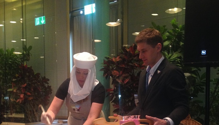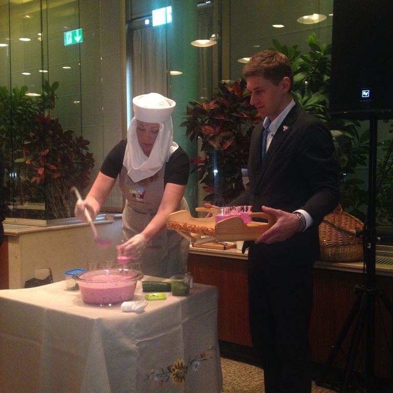 „Mes Lietuvoje sakome, kad kelias į širdį eina per skrandį, todėl šiandien vaišinsiu jus vienu populiariausių patiekalų Lietuvoje – šaltibarščiais“, – sakė VTD vadovė J. Kazlauskienė. Kol ji pjaustė agurkus, maišė iš Lietuvos atsivežtą rūgpienį ir burokėlius, Lietuva renginio svečiams buvo pristatyta kaip šalis, kurią globalus kelionių gidas „Lonely Planet“ įtraukė į šalių, privalomų pamatyti 2015 m., dešimtuką.