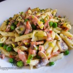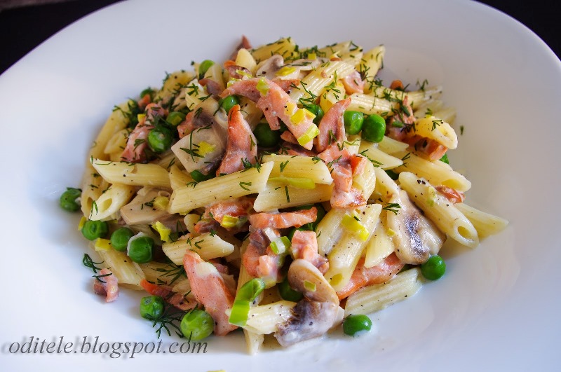Keptuvės turinį šiek tiek pastumkite į šoną, o kitoje pusėje apie pusę minutės pakepinkite smulkintą česnaką. Dėkite atšildytus žirnelius, grietinę, supilkite grietinėlę, pagardinkite juodaisiais pipirais ir, jei reikia, druska (jos turėtų pakakti nuo lašišos). Viską išmaišykite ir, kai užvirs, nukelkite nuo ugnies.