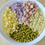 Į gilų dubenį sudėkite makaronus, kubeliais supjaustytą vištieną ir sūrį, susmulkintą svogūną, krapus, berkite žirnelius, druskos ir pipirų.