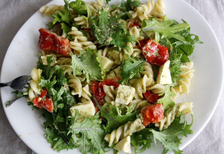 Dideliame dubenyje sumaišome makaronus su mocarelos sūriu, keptomis paprikomis, gražgarstėmis ir pesto padažu. Iškart patiekiame.