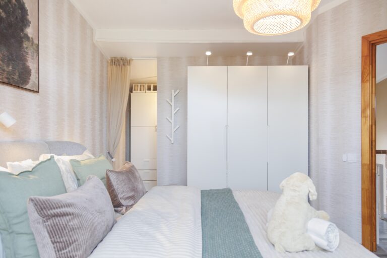 „Greta lovos pastatomi staliniai šviestuvai kuria švelnią, atpalaiduojančią atmosferą. Negana to, galvūgalyje pakabinti sieniniai-skaitymo šviestuvai, įrengtas apšvietimas spintos viduje bei drabužinėje, kurie suteikia papildomo funkcionalumo. Siekiant užtikrinti geresnę miego kokybę, pakabintos šviesos nepraleidžiančios užuolaidos, taip pat šalia lovos pastatytas oro valytuvas“, – pasakoja A. Šiaudvytienė.