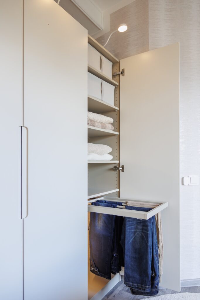 Spintose ir stalčiuose naudokite dėžes ir įdėklus. Šis paprastas sprendimas padeda atskirti drabužių, aksesuarų ir smulkių daiktų kategorijas, todėl lengviau rasti tai, ko reikia. Be to, vizualiai tvarkinga erdvė padeda palaikyti švaros įprotį.
