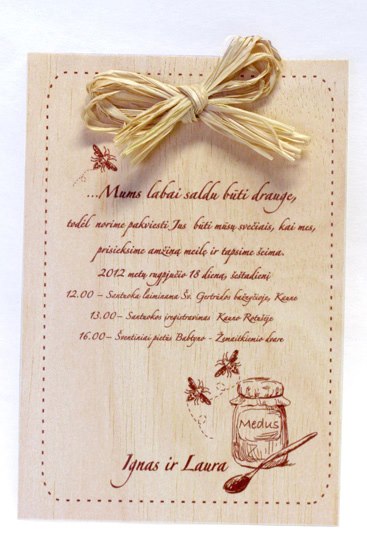 Medis jau nuo seno žinomas kaip tvirtybės ir šilumos simbolis, jis spinduliuoja teigiama energija. Pagamintas medinis atvirukas yra šiltas ir išskirtinis, turi tik jam būdingą medžio tekstūrą ir spalvą. Medinė vizitinė kortelė, atvirukas ar skirtukas žavus tuo, kad nebus nė vieno tokio paties. Tuo jie ir ypatingi.