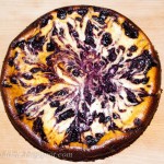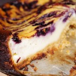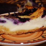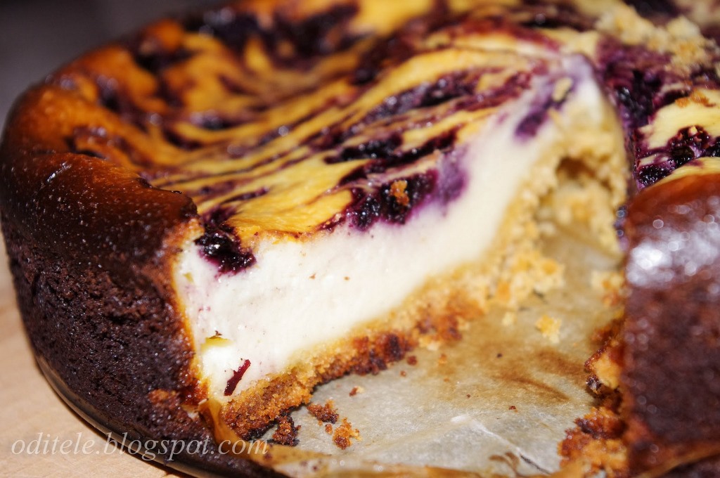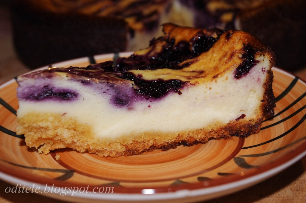 Visus likusius produktus gerai išmaišykite ir supilkite ant sausainių masės. Viršų išmarginkite mėlynėmis (naudokite arbatinį šaukštelį). Pyragą kepkite orkaitėje, kol, įsmeigus medinį pagaliuką, jis liks švarus.