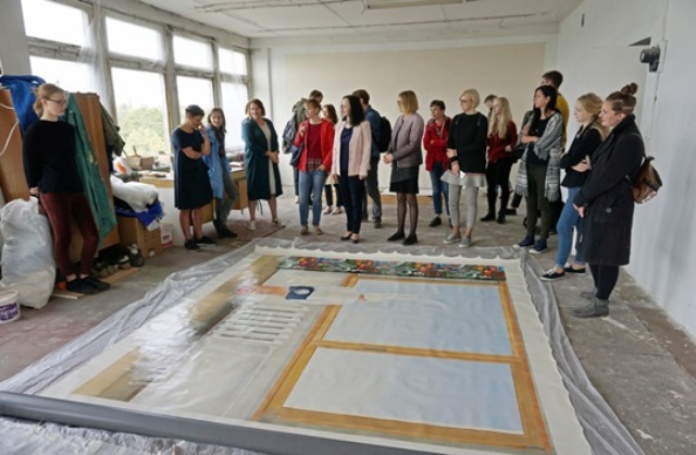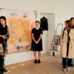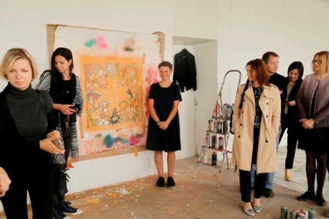 Dirbtuvės šeimininkė E. Ridikaitė svečiams pristatė didžiulių matmenų darbą iš ciklo „Atėjai, pamatei, išėjai: kultūringos grindys“, ankstesnių metų darbą „Kitas zuikis“ (2011) ir šiuo metu kuriamą ciklo „Palikimas (babutas skarialas)“ darbą, kur aerozoliu ant drobės išpurkštos Eglės Ridikaitės močiutės ryšėtos skarelės.