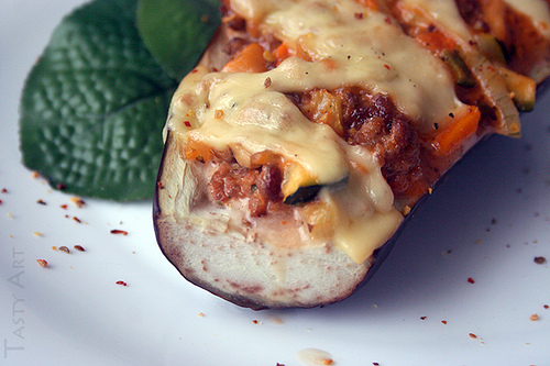 Ant baklažano įdaro sudėliojame juostelėmis supjaustyto sūrio griežinėlius. Šiek tiek užlenkę folijos kraštelius pašauname į orkaitę. Kepame 200 °C temperatūroje maždaug 15−20 minučių. Skanaus!