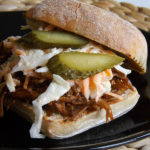 - Kepkite apie 3–3,5 valandos (arba kol mėsa lengvai kris plonais ruoželiais).
