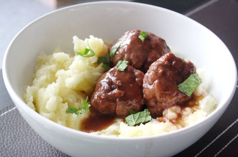 Įkaitinti orkaitę iki 180 °C. Batoną sudėti į vidutinį dubenį ir užpylus pienu palikti 10 minučių. Tada nusunkti ir nugręžti pieną. Į didelį dubenį sudėti batoną, maltą jautieną, supilti plaktus kiaušinius, suberti smulkintą svogūną, petražoles, druską, pipirus ir čiobrelius. Rankomis viską gerai išmaišyti.
