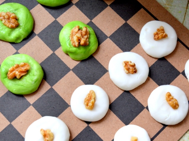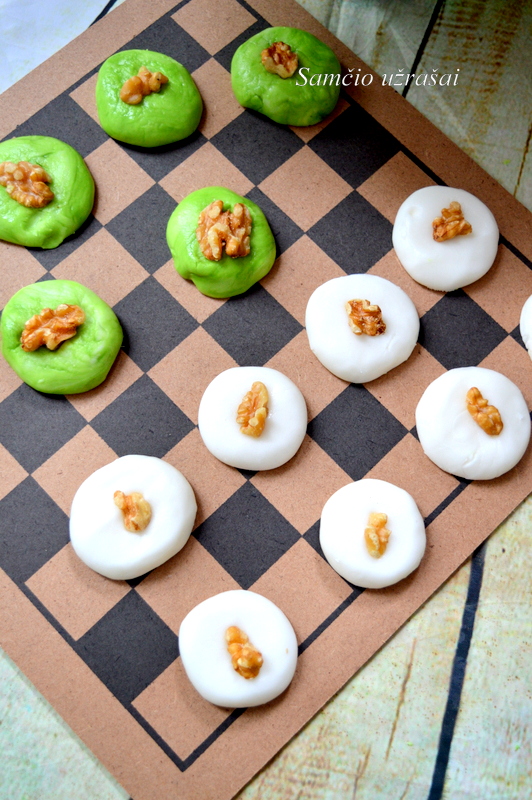 Formuokite nedidelius saldainiukus, juos paspauskite ir uždėkite po riešuto gabaliuką.