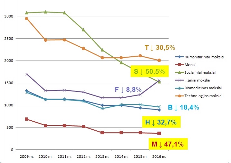 Požiūrį į socialinius ir humanitarinius mokslus atspindi ir valstybės finansavimo politika – šių sričių universitetinės studijos pastaraisiais metais sulaukia 2–3 kartus mažiau valstybės lėšų nei technologijos mokslai. Nors socialinių mokslų srities studijų programas 2016 m. pirmuoju numeriu, lyginant su ketinančiais studijuoti technologijos mokslus, rinkosi 2,4 karto daugiau stojančiųjų, valstybės finansuojamų studijų vietų paskirstymas buvo priešingas: socialinių mokslų sričiai skirta 1,3 karto mažiau studijų vietų.